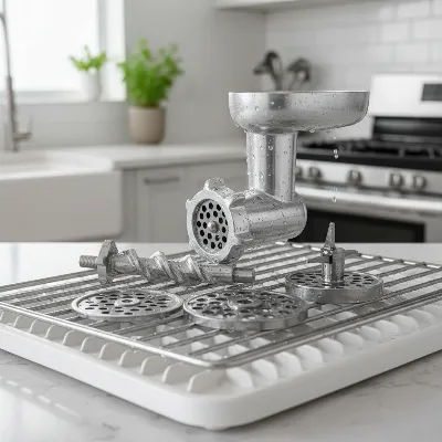 A user carefully disassembling a meat grinder into its individual components for cleaning, with parts laid out on a clean surfaceA user carefully disassembling a meat grinder into its individual components for cleaning, with parts laid out on a clean surface